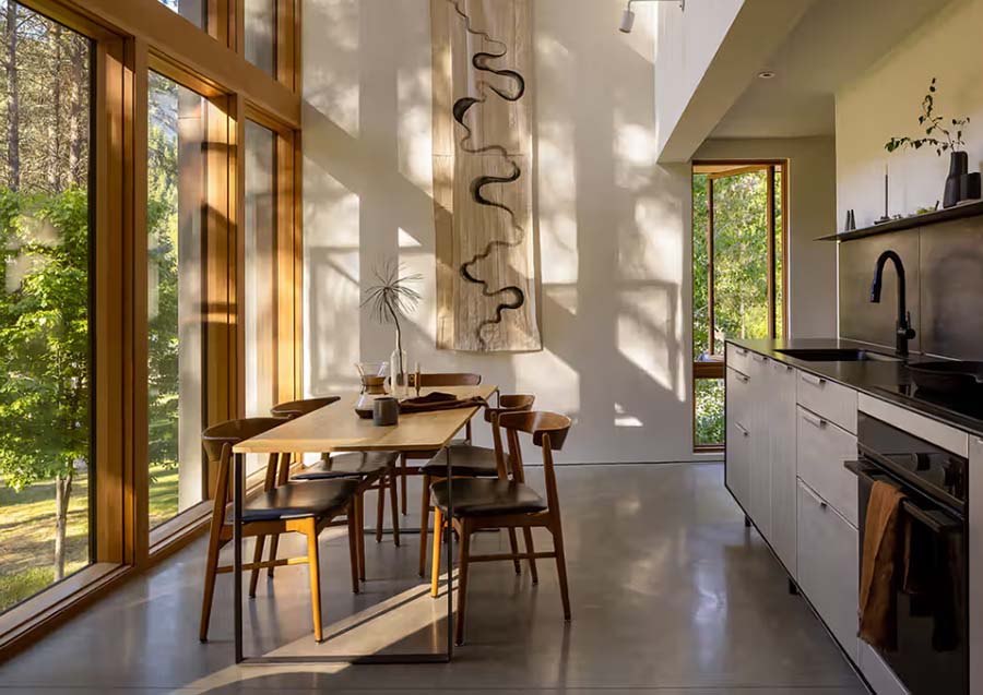 Velike staklene površine, posebno prozor koji se proteže gotovo celom širinom fasade okrenute ka reci, brišu granicu između enterijera i spoljašnjosti, uvodeći pejzaž direktno u prostor za život i rad.
