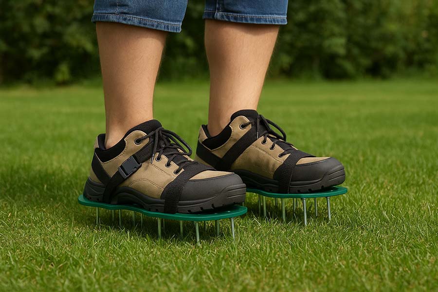 Ovo je mnogo lakši i jednostavniji način. Nisu to prave cipele, već u pitanju su dodaci koje stavite na obuću, a na njima se nalaze šiljci. Samo hodate po travnjaku i istovremeno ga aerirate. Ovo je super opcija za redovno održavanje, ali ne prodire baš duboko u zemlju – pa više služi kao “osvežavanje” nego kao prava aeracija.