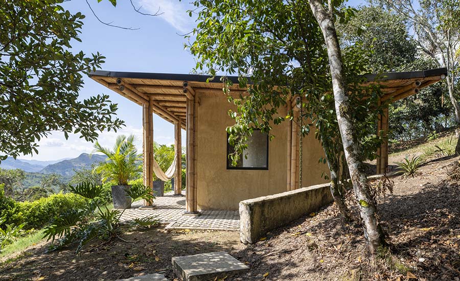 Materijali su pažljivo birani kako bi se postigla ravnoteža između tradicije i savremenog izraza. Bambus, vekovima prisutan u kolumbijskoj gradnji, ovde dobija novu, modernu ulogu – stubovi napravljeni od četiri ukrštene bambusove cevi oslanjaju se na čelične baze, kombinujući ručni rad s preciznošću i elegancijom.