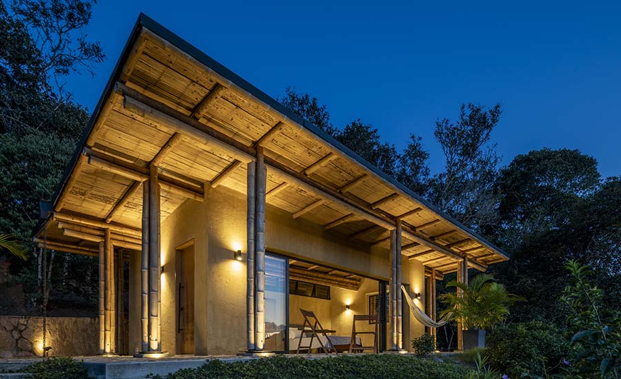 Na prvi pogled, kuća izgleda kao da lebdi između drveća. Konstrukcija od bambusa, tanak metalni okvir i karakterističan „leptir“ krov savršeno se uklapaju u pejzaž. Sve je izvedeno iz minimum uticaja na prirodnu sredinu.