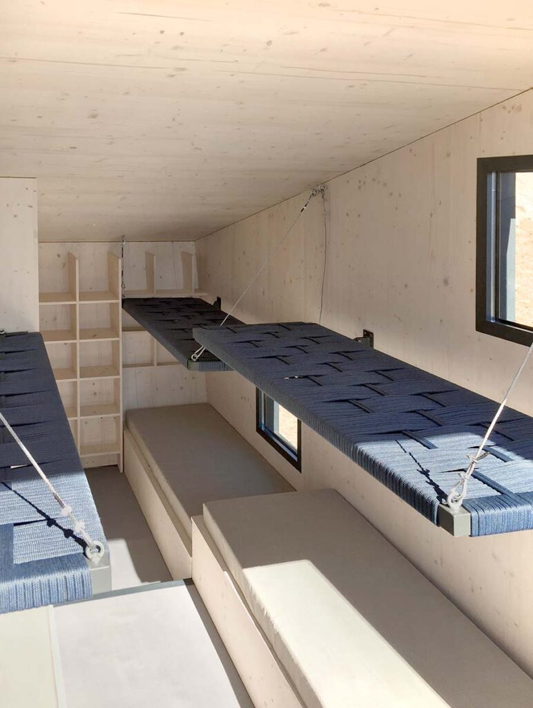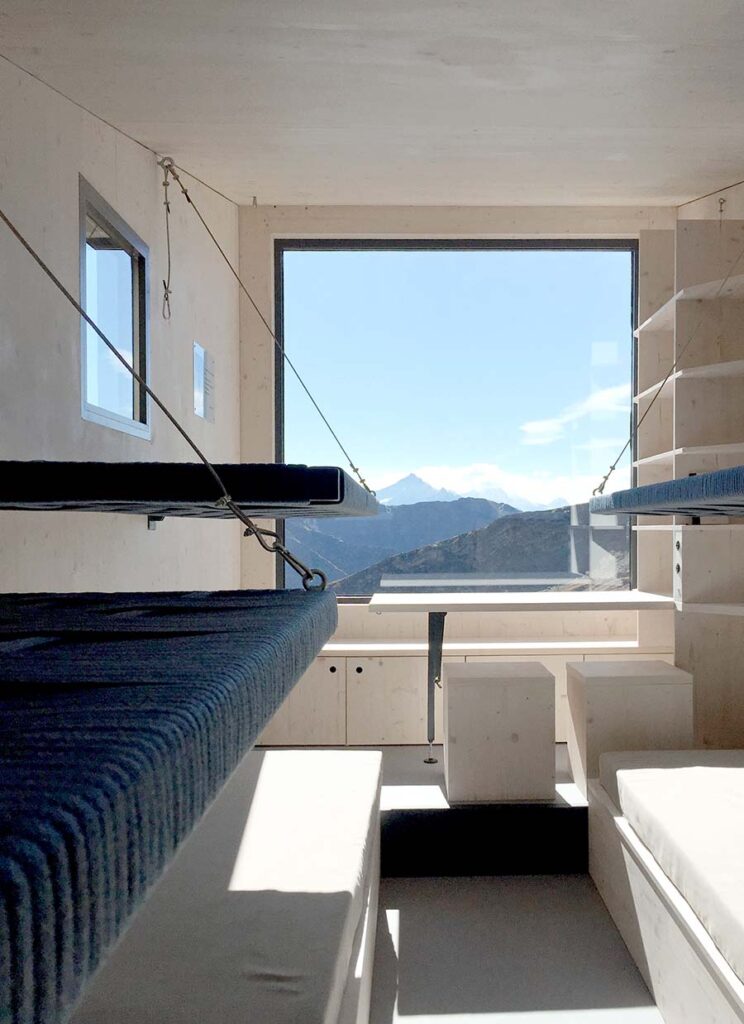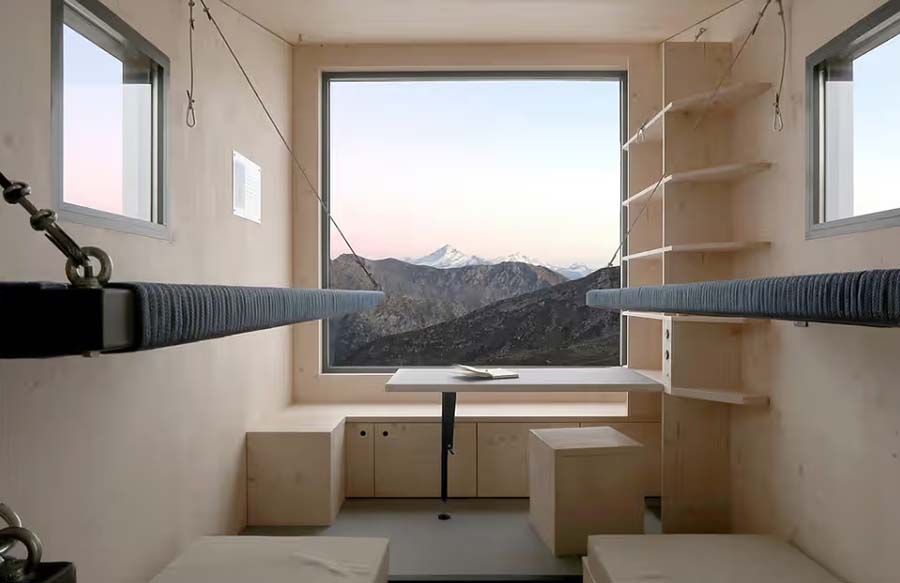 Sa obe strane smešteni su sklopivi ležajevi napravljeni od užadi za penjanje, dok se na kraju kolibe nalazi zajednički prostor iz kojeg se pruža zadivljujući pogled na dolinu. Ulazni predprostor služi kao tampon zona protiv vetra i snega, ali i kao mesto za odlaganje opreme.