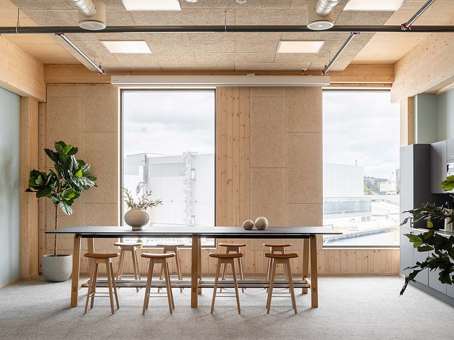 Unutrašnjost zgrade osmišljena je tako da naglasi prirodne kvalitete drveta. Noseći elementi su vidljivi, stvarajući topao i prijatan ambijent koji doprinosi udobnosti zaposlenih.