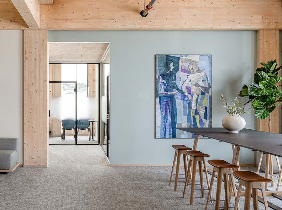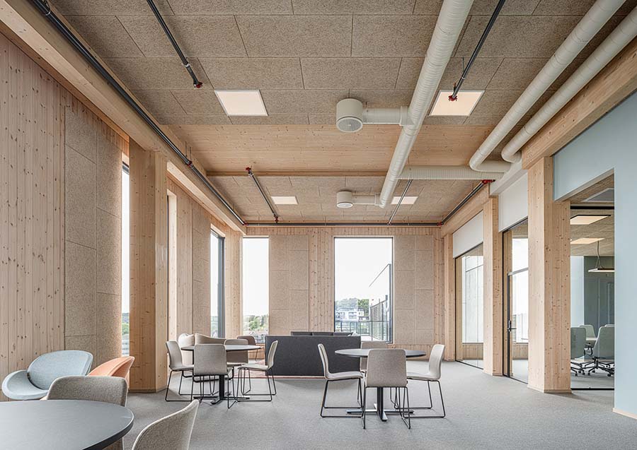 Ventilacioni kanali i tehnički elementi pažljivo su uklopljeni u tonove drveta, kako bi se postigla vizuelna harmonija. U centralnom delu nalazi se svetao atrijum sa stepeništem od CLT ploča, koji povezuje spratove i unosi dodatnu dozu prostorne dinamike i prirodnog svetla.