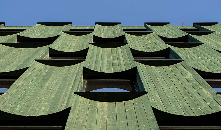 Najveću pažnju privlači fasada, izrađena od prefabrikovanih, blago zakrivljenih drvenih panela tretiranih zelenim katranom. Oni se nižu u ponavljajućem ritmu i stvaraju utisak pokreta – tokom dana svetlost i senke neprestano menjaju izgled zgrade, pa fasada „diše“ zajedno s okolinom. Vremenom, pod uticajem sunca, kiše i mraza, nijanse drveta će se prirodno menjati, dajući objektu patinu i karakter koji se razvija s godinama.