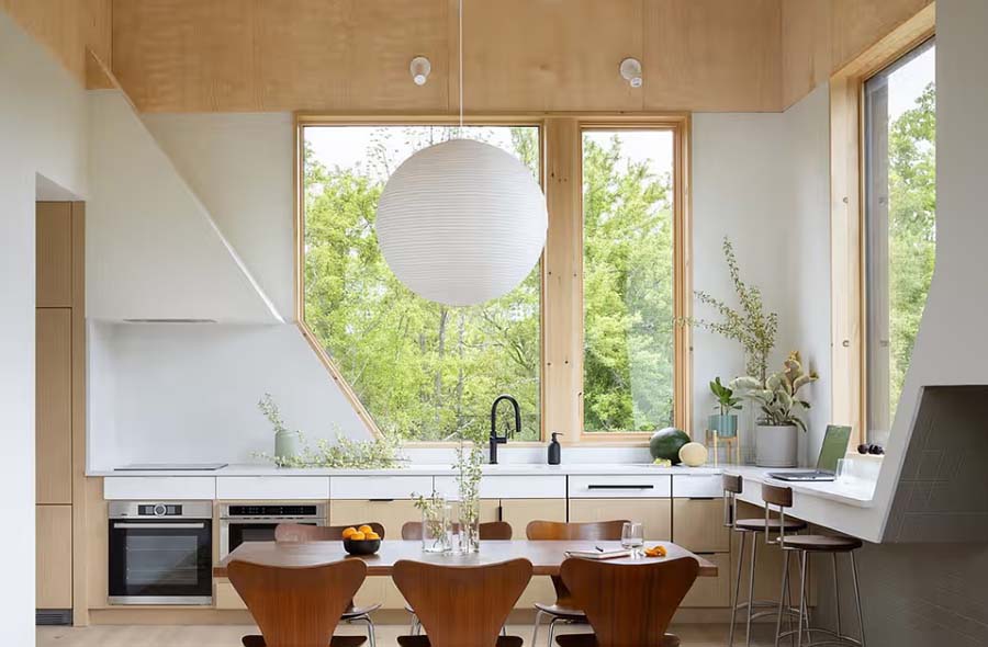 Centralni deo kuće čini dnevna zona sa trpezarijom i kuhinjom, koja se prostire u dvostrukoj visini i otvara prema pejzažu kroz velike staklene površine. Pogled na okolno zelenilo na tj način postaje deo svakodnevnog života.