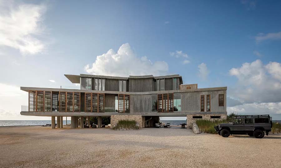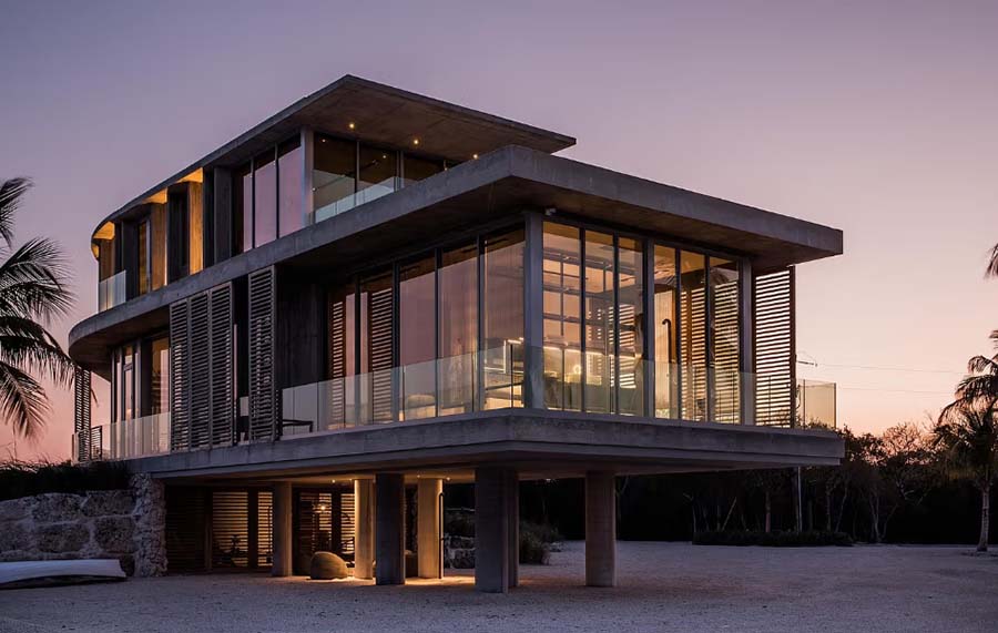 Projekat potpisuje studio STRANG iz Majamija, poznat po pristupu koji modernu arhitekturu gradi u dijalogu sa prirodnim okruženjem, a ne nasuprot njemu. Kuća je podignuta na uzdignutoj konstrukciji kako bi bila zaštićena od poplava i naleta olujnih talasa, dok otvoreni prizemni deo omogućava protok vazduha i nesmetan pogled na okolni pejzaž.