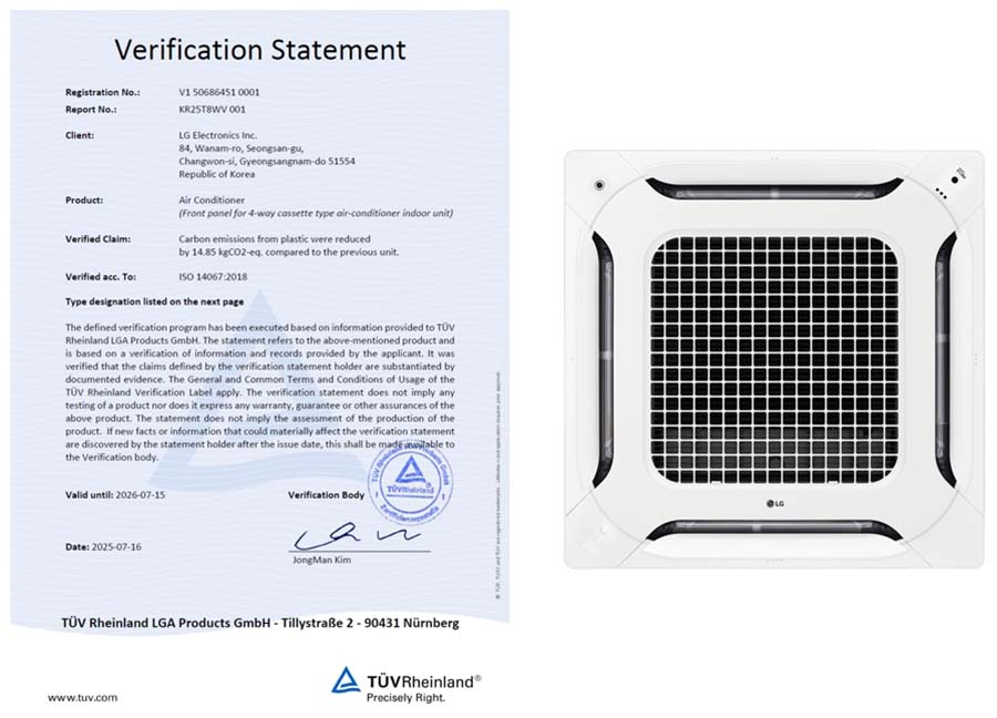 TÜV Rheinland, globalna organizacija za testiranje i sertifikaciju, nedavno je potvrdila da novi LG proizvodni proces smanjuje emisiju ugljen-dioksida tokom proizvodnje klima sistema sa 4 smera na 14,85 kilograma CO₂ ekvivalenta* po jedinici.