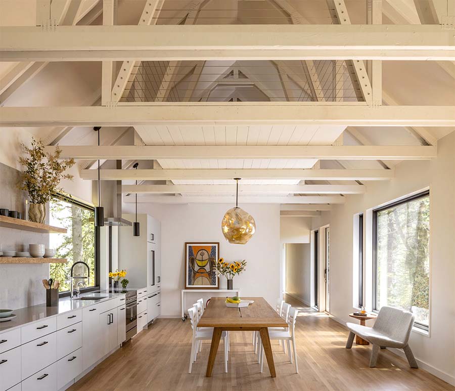 Ono što je posebno dopadljivo je kontrast spoljašnjosti i unutršnjosti. Dok se fasada tamnije boje savršeno uklapa sa šumskim pejzažom, unutrašnjošću dominira bela boja što kreira osećaj prostranosti. Takođe, daje ovoj kući smeštenoj među krošnjama dovoljno svetlosti.
