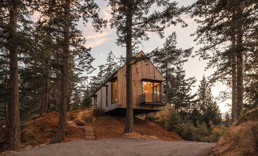 Zamislite drvenu kućicu koja lebdi iznad šumovitog grebena, tiho se oslanjajući samo na šest tankih tačaka dodira sa zemljom, kao da je prijatelj prirode u potpunosti poštovao njeno prisustvo. Upravo to je North South House – prava porodična koliba, smeštena na grebenu ostrva Orcas u Vašingtonu i dizajnirana da živi u harmoniji sa šumom koja je okružuje.