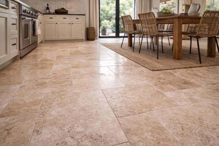 Krečnjak je sličan travertinu po toplini i prirodnom izgledu, ali ima ujednačeniju teksturu i mirnije tonove. Često se koristi u modernim enterijerima gde se traži suptilan, prirodan pod koji neće dominirati prostorom.