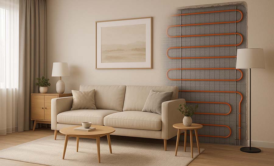 Međutim, zidno grejanje ima jednu značajnu prednost – ono može da funkcioniše i kao sistem za hlađenje. Kada se kroz isti sistem provodi rashlađena voda, zidovi preuzimaju ulogu velikih rashladnih površina koje snižavaju temperaturu prostora bez buke, promaje ili strujanja vazduha karakterističnog za klima uređaje.